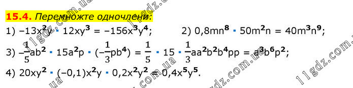Перемножте одночлени: 1) –13x2y ∙ 12ху3 = –156х3у4; 2) 0,8mn8 ∙ 50m2n = 40m3n9; 3) –1/5ab2 ∙ 15a2p ∙ (–1/3pb4) = 1/5 ∙ 15 ∙ 1/3aa2b2b4pp = a3b6p2; 4) 20xy2 ∙ (–0,1)х2у ∙ 0,2х2y2 = 0,4х5y5.