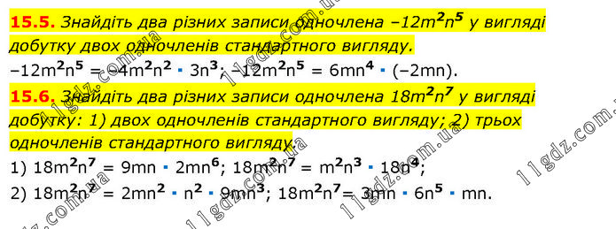 15.5. Знайдіть два різних записи одночлена –12m2n5 у вигляді добутку двох одночленів стандартного вигляду. –12m2n5 = –4m2n2 ∙ 3n3; –12m2n5 = 6mn4 ∙ (–2mn). 15.6. Знайдіть два різних записи одночлена 18m2n7 у вигляді добутку: 1) двох одночленів стандартного вигляду; 2) трьох одночленів стандартного вигляду. 1) 18m2n7 = 9mn ∙ 2mn6; 18m2n7 = m2n3 ∙ 18n4; 2) 18m2n7 = 2mn2 ∙ n2 ∙ 9mn3; 18m2n7= 3mn ∙ 6n5 ∙ mn.