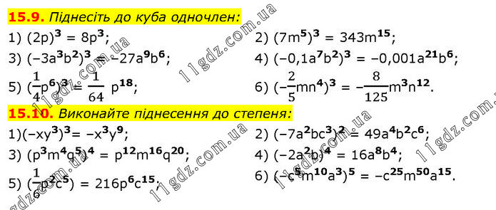 15.9. Піднесіть до куба одночлен: 1) (2р)3 = 8p3; 3) (–3a3b2)3 = –27а9b6; 5) (1/4p6)3 = 1/64 p18; 2) (7m5)3 = 343m15; 4) (–0,1а7b2)3 = –0,001а21b6; 6) (–2/5mn4)3 = –8/125m3n12. 15.10. Виконайте піднесення до степеня: 1)(–хy3)3= –х3y9; 3) (p3m4q5)4 = p12m16q20; 5) (1/6p2c5) = 216р6c15; 2) (–7a2bc3)2 = 49а4b2c6; 4) (–2a2b)4 = 16a8b4; 6) (–c5m10a3)5 = –c25m50a15.