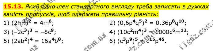 Який одночлен стандартного вигляду треба записати в дужках замість пропусків, щоб одержати правильну рівність: 1) (2m3)2 = 4m6; 3) (–2с3)3 = –8с9; 5) (2аb2)4 = 16a4b8; 2) (0,6р4q5)2 = 0,36p8q10; 4) (10c2m4)3 = 1000c6m12; 6) (с3p9)5 = с15p45.