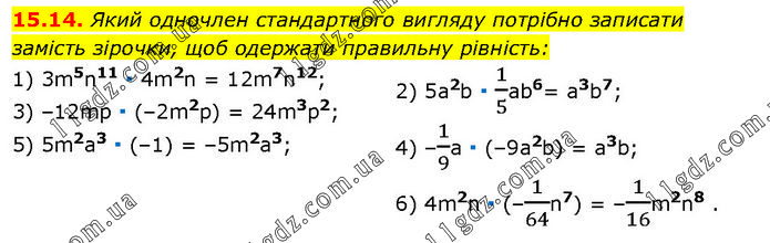 Який одночлен стандартного вигляду потрібно записати замість зірочки, щоб одержати правильну рівність: 1) 3m5n11 ∙ 4m2n = 12m7n12; 3) –12mp ∙ (–2m2р) = 24m3p2; 5) 5m2a3 ∙ (–1) = –5m2a3; 2) 5а2b ∙ 1/5ab6= a3b7; 4) –1/9а ∙ (–9а2b) = а3b; 6) 4m2n ∙ (–1/64n7) = –1/16m2n8 .
