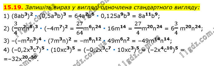 Запишіть вираз у вигляді одночлена стандартного вигляду: 1) (8аb3)2 ∙ (0,5а3b)3 = 64а2b6 ∙ 0,125а9b3 = 8а11b9; 2) (3/4m2n8)3 ∙ (–4m7)2 = 27/64m6n24 ∙ 16m14 = 27/4m20n24 = 63/4 m20n24; 3) –(–m2n3)4 ∙ (7m3n)2 = –m8n12 ∙ 49m6n2 = –49m14n14; 4) (–0,2х3с7)5 ∙ (10xc3)5 = (–0,2х3с7 ∙ 10xc3)5 = (–2х4с10)5 = =–32х20с50.