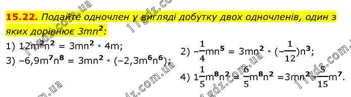 Подайте одночлен у вигляді добутку двох одночленів, один з яких дорівнює 3mn2: 1) 12m2n2 = 3mn2 ∙ 4m; 3) –6,9m7n8 = 3mn2 ∙ (–2,3m6n6); 2) –1/4mn5 = 3mn2 ∙ (–1/12)n3; 4) 11/5m8n2 = 6/5m8n2 =3mn2 ∙5/15m7.
