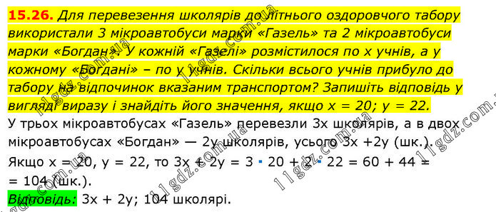 Для перевезення школярів до літнього оздоровчого табору використали 3 мікроавтобуси марки «Газель» та 2 мікроавтобуси марки «Богдан». У кожній «Газелі» розмістилося по х учнів, а у кожному «Богдані» – по у учнів. Скільки всього учнів прибуло до табору на відпочинок вказаним транспортом? Запишіть відповідь у вигляді виразу і знайдіть його значення, якщо х = 20; у = 22. У трьох мікроавтобусах «Газель» перевезли 3x школярів, а в двох мікроавтобусах «Богдан» — 2у школярів, усього 3x +2у (шк.). Якщо х = 20, у = 22, то 3х + 2y = 3 ∙ 20 + 2 ∙ 22 = 60 + 44 = = 104 (шк.). Відповідь: 3х + 2у; 104 школярі.