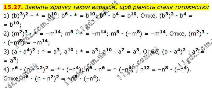 Замініть зірочку таким виразом, щоб рівність стала тотожністю: 1) (b)3)2 – * = b10; b6 ∙ * = b10; b6 ∙ b4 = b10. Отже, (b3)2 ∙ b4 = = b10; 2) (m2)3 ∙ * = –m14; m6 ∙ * = –m14; m6 ∙ (–m8) = –m14. Отже, (m2)3 ∙ ∙ (–m8) = –m14; 3) (а ∙ a4)2 : * = а3; а10 : * = a3; а10 : а7 = a3. Отже, (а ∙ а4)2 : а7 = = а3; 4) n6 ∙ (n ∙ n2)2 = * ∙ (–n4); n6 ∙ n6 = * (–n4) ; n12 = –n8 ∙ (–n4). Отже, n6 ∙ (n ∙ n2)2 = –n8 ∙ (–n4).
