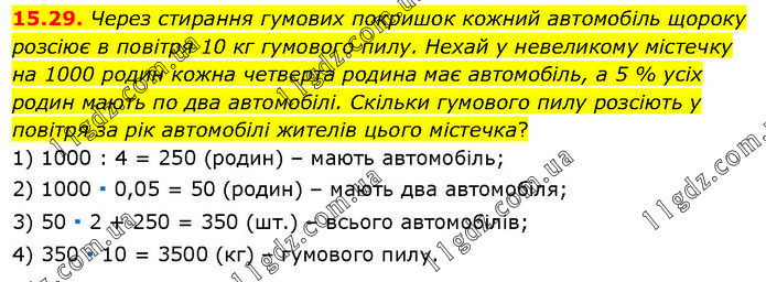 Через стирання гумових покришок кожний автомобіль щороку розсіює в повітря 10 кг гумового пилу. Нехай у невеликому містечку на 1000 родин кожна четверта родина має автомобіль, а 5 % усіх родин мають по два автомобілі. Скільки гумового пилу розсіють у повітря за рік автомобілі жителів цього містечка? 1) 1000 : 4 = 250 (родин) – мають автомобіль; 2) 1000 ∙ 0,05 = 50 (родин) – мають два автомобіля; 3) 50 ∙ 2 + 250 = 350 (шт.) – всього автомобілів; 4) 350 ∙ 10 = 3500 (кг) – гумового пилу.