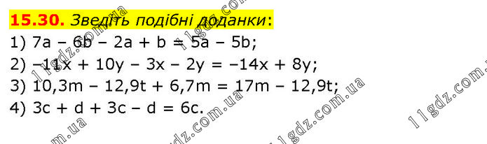 Зведіть подібні доданки: 1) 7а – 6b – 2а + b = 5a – 5b; 2) –11х + 10у – 3x – 2у = –14x + 8y; 3) 10,3m – 12,9t + 6,7m = 17m – 12,9t; 4) 3c + d + Зс – d = 6c.