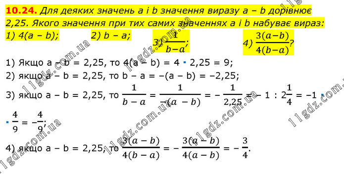Для деяких значень а і b значення виразу а – b дорівнює 2,25. Якого значення при тих самих значеннях а і b набуває вираз: 1) 4(а – b); 2) b – а; 3) 1/(b-a); 4) (3(a-b))/(4(b-a))? 1) Якщо а – b = 2,25, то 4(а – b) = 4 ∙ 2,25 = 9; 2) якщо а – b = 2,25, то b – а = –(а – b) = –2,25; 3) якщо а – b = 2,25, то 1/(b - a) = 1/(-(a - b)) = – 1/2,25 = – 1 : 21/4 = –1 ∙ ∙ 4/9 = –4/9; 4) якщо а – b = 2,25, то (3(a - b))/(4(b - a)) = – (3(a - b))/(4(a - b)) = – 3/4.