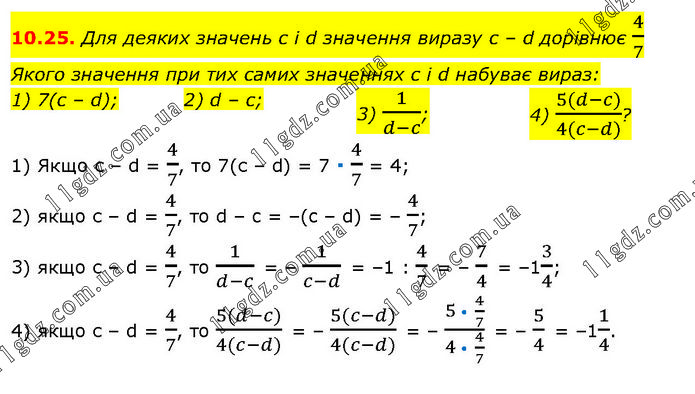 Для деяких значень с і d значення виразу с – d дорівнює 4/7 Якого значення при тих самих значеннях с і d набуває вираз: 1) 7(c – d); 2) d – c; 3) 1/(d-c); 4) (5(d-c))/(4(c-d))? 1) Якщо с – d = 4/7, то 7(с – d) = 7 ∙ 4/7 = 4; 2) якщо с – d = 4/7, то d – c = –(c – d) = – 4/7; 3) якщо с – d = 4/7, то 1/(d-c) = – 1/(c-d) = –1 : 4/7 = – 7/4 = –13/4; 4) якщо с – d = 4/7, то (5(d-c))/(4(c-d)) = – (5(c-d))/(4(c-d)) = – (5 • 4/7)/(4 • 4/7) = – 5/4 = –11/4.
