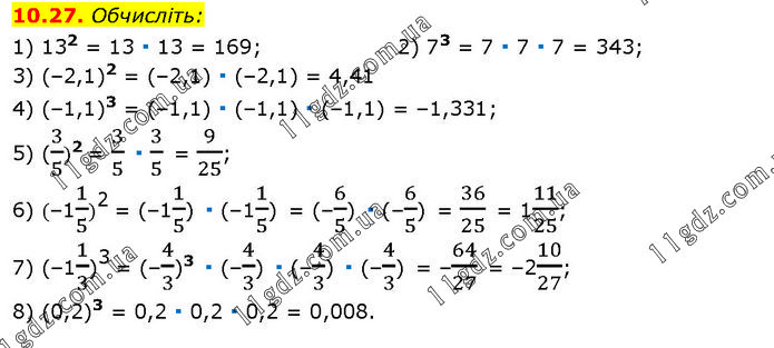 Обчисліть: 1) 132 = 13 ∙ 13 = 169; 2) 73 = 7 ∙ 7 ∙ 7 = 343; 3) (–2,1)2 = (–2,1) ∙ (–2,1) = 4,41 4) (–1,1)3 = (–1,1) ∙ (–1,1) ∙ (–1,1) = –1,331; 5) (3/5)2 = 3/5 ∙ 3/5 = 9/25; 6) (–11/5)2 = (–11/5) ∙ (–11/5) = (–6/5) ∙ (–6/5) = 36/25 = 111/25; 7) (–11/3)3 = (–4/3)3 ∙ (–4/3) ∙ (–4/3) ∙ (–4/3) = –64/27 = –210/27; 8) (0,2)3 = 0,2 ∙ 0,2 ∙ 0,2 = 0,008.