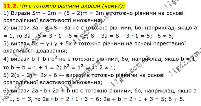 Чи є тотожно рівними вирази (чому?): 1) Вирази 5m – 2m = (5 – 2)m = 3m є тотожно рівними на основі розподільної властивості множення; 2) вирази 3а – 8 і 8 – 3а не є тотожно рівними, бо, наприклад, якщо а = 1, то 3а – 8 = 3 ∙ 1 – 8 = –5; 8 – 3a = 8 – 3 ∙ 1 = 5; –5 ≠ 5; 3) вирази 5x + y і y + 5x є тотожно рівними на основі переставної властивості додавання; 4) вирази b + b і b2 не є тотожно рівними, бо, наприклад, якщо b = 1, то b + b = 1 + 1 = 2; b2 = 12 = 1; 2 ≠ 1; 5) 2(x – 3) = 2x – 6 — вирази є тотожно рівними на основі розподільної властивості множення; 6) вирази 2a ∙ b і 2a + b не є тотожно рівними, бо, наприклад, якщо a = 1, b = 3, то 2a ∙ b = 2 ∙ 1 ∙ 3 = 6; 2a + b = 2 ∙ 1 + 3 = 5; 6 ≠ 5.