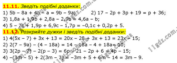 11.11. Зведіть подібні доданки: 1) 5b – 8а + 4b – а = 9b – 9а; 2) 17 – 2р + Зр + 19 = p + 36; 3) 1,8а + 1,9b + 2,8а – 2,9b = 4,6а – b; 4) 5 – 7с + 1,9р + 6,9с – 1,7р = –0,1с + 0,2p + 5. 11.12. Розкрийте дужки і зведіть подібні доданки: 1) 4(5х – 7) + Зх + 13 = 20х – 28 + 3x + 13 = 23х – 15; 2) 2(7 – 9а) – (4 – 18а) = 14 – 18а – 4 + 18а= 10; 3) 3(2р – 7) – 2(р – 3) = 6р – 21 – 2р + 6 = 4р – 15; 4) –(Зm – 5) + 2(3m – 7) = –3m + 5 + 6m – 14 = 3m – 9.