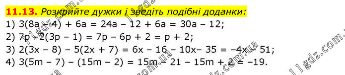 Розкрийте дужки і зведіть подібні доданки: 1) 3(8а – 4) + 6а = 24а – 12 + 6а = 30а – 12; 2) 7р –2(3р – 1) = 7р – 6р + 2 = р + 2; 3) 2(3х – 8) – 5(2х + 7) = 6х – 16 – 10x– 35 = –4х – 51; 4) 3(5m – 7) – (15m – 2) = 15m – 21 – 15m + 2 = –19.