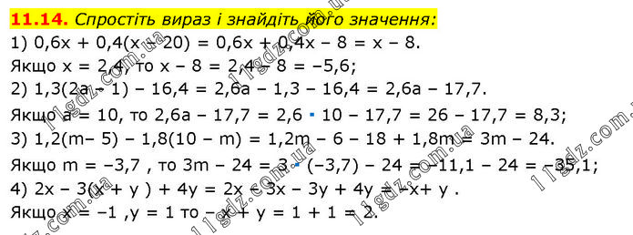 Спростіть вираз і знайдіть його значення: 1) 0,6x + 0,4(х – 20) = 0,6x + 0,4х – 8 = х – 8. Якщо х = 2,4, то х – 8 = 2,4 – 8 = –5,6; 2) 1,3(2а – 1) – 16,4 = 2,6а – 1,3 – 16,4 = 2,6а – 17,7. Якщо а = 10, то 2,6а – 17,7 = 2,6 ∙ 10 – 17,7 = 26 – 17,7 = 8,3; 3) 1,2(m– 5) – 1,8(10 – m) = 1,2m – 6 – 18 + 1,8m = 3m – 24. Якщо m = –3,7 , то 3m – 24 = 3 ∙ (–3,7) – 24 = –11,1 – 24 = –35,1; 4) 2х – 3(х + у ) + 4у = 2х – 3х – 3у + 4у = –х + у. Якщо х = –1 ,у = 1 то – x + y = 1 + 1 = 2.