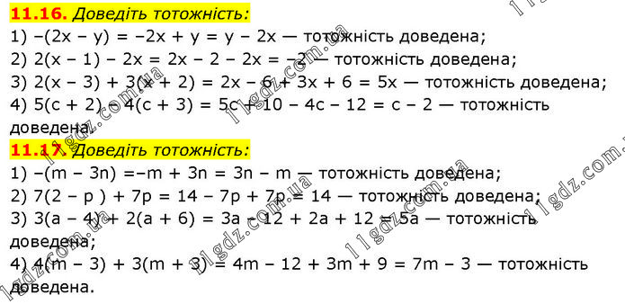 11.16. Доведіть тотожність: 1) –(2х – у) = –2х + у = у – 2х — тотожність доведена; 2) 2(х – 1) – 2х = 2х – 2 – 2х = –2 — тотожність доведена; 3) 2(х – 3) + 3(х + 2) = 2х – 6 + Зх + 6 = 5х — тотожність доведена; 4) 5(с + 2) – 4(с + 3) = 5с + 10 – 4с – 12 = с – 2 — тотожність доведена. 11.17. Доведіть тотожність: 1) –(m – 3n) =–m + 3n = 3n – m — тотожність доведена; 2) 7(2 – р ) + 7p = 14 – 7p + 7p = 14 — тотожність доведена; 3) 3(а – 4) + 2(а + 6) = 3а – 12 + 2а + 12 = 5а — тотожність доведена; 4) 4(m – 3) + 3(m + 3) = 4m – 12 + Зm + 9 = 7m – 3 — тотожність доведена.