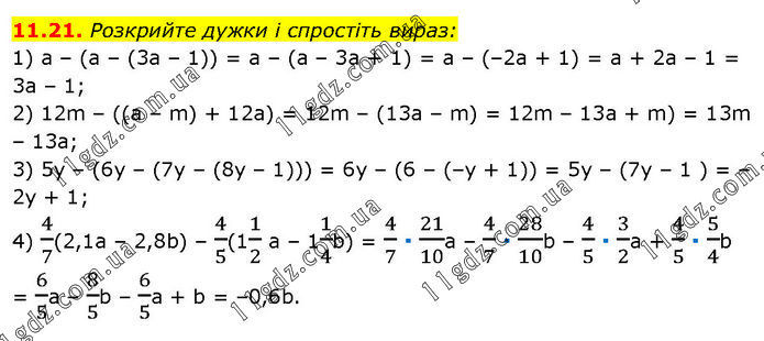 Розкрийте дужки і спростіть вираз: 1) а – (а – (3а – 1)) = а – (а – 3а + 1) = а – (–2а + 1) = а + 2а – 1 = 3а – 1; 2) 12m – ((а – m) + 12а) = 12m – (13а – m) = 12m – 13а + m) = 13m – 13а; 3) 5у – (6у – (7у – (8у – 1))) = 6y – (6 – (–у + 1)) = 5у – (7y – 1 ) = –2у + 1; 4) 4/7(2,1a – 2,8b) – 4/5(11/2 a – 11/4b) = 4/7 ∙ 21/10a – 4/7 ∙ 28/10b – 4/5 ∙ 3/2a + 4/5 ∙ 5/4b = 6/5a – 8/5b – 6/5a + b = –0,6b.
