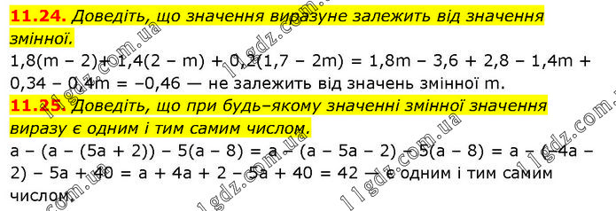 11.24. Доведіть, що значення виразуне залежить від значення змінної. 1,8(m – 2)+ 1,4(2 – m) + 0,2(1,7 – 2m) = 1,8m – 3,6 + 2,8 – 1,4m + 0,34 – 0,4m = –0,46 — не залежить від значень змінної m. 11.25. Доведіть, що при будь–якому значенні змінної значення виразу є одним і тим самим числом. а – (а – (5а + 2)) – 5(а – 8) = а – (а – 5а – 2) – 5(а – 8) = а – (–4а – 2) – 5а + 40 = а + 4а + 2 – 5а + 40 = 42 — є одним і тим самим числом.