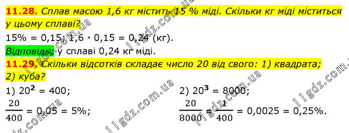 11.28. Сплав масою 1,6 кг містить 15 % міді. Скільки кг міді міститься у цьому сплаві? 15% = 0,15; 1,6 ∙ 0,15 = 0,24 (кг). Відповідь: у сплаві 0,24 кг міді. 11.29. Скільки відсотків складає число 20 від свого: 1) квадрата; 2) куба? 1) 202 = 400; 2) 203 = 8000; 20/400 = 0,05 = 5%; 20/8000 = 1/400 = 0,0025 = 0,25%.