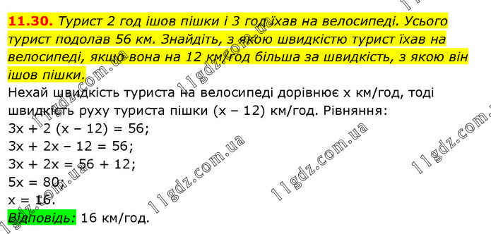 Турист 2 год ішов пішки і 3 год їхав на велосипеді. Усього турист подолав 56 км. Знайдіть, з якою швидкістю турист їхав на велосипеді, якщо вона на 12 км/год більша за швидкість, з якою він ішов пішки. Нехай швидкість туриста на велосипеді дорівнює х км/год, тоді швидкість руху туриста пішки (х – 12) км/год. Рівняння: 3х + 2 (х – 12) = 56; 3х + 2х – 12 = 56; 3х + 2х = 56 + 12; 5х = 80; х = 16. Відповідь: 16 км/год.