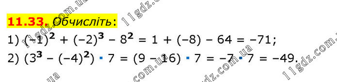 Обчисліть: 1) (–1)2 + (–2)3 – 82 = 1 + (–8) – 64 = –71; 2) (33 – (–4)2) ∙ 7 = (9 – 16) ∙ 7 = –7 ∙ 7 = –49.