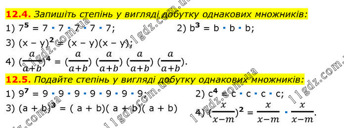 12.4. Запишіть степінь у вигляді добутку однакових множників: 1) 75 = 7 ∙ 7 ∙ 7 ∙ 7 ∙ 7; 2) b3 = b ∙ b ∙ b; 3) (x – y)2 = (x – y)(x – y); 4) (a/(a+b))4 = (a/(a+b)) (a/(a+b)) (a/(a+b)) (a/(a+b)). 12.5. Подайте степінь у вигляді добутку однакових множників: 1) 97 = 9 ∙ 9 ∙ 9 ∙ 9 ∙ 9 ∙ 9 ∙ 9; 2) c4 = c ∙ c ∙ c ∙ c; 3) (a + b)3 = ( a + b)( a + b)( a + b) 4) (x/(x-m))2 = x/(x-m) ∙ x/(x-m).
