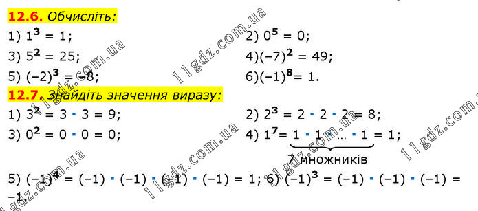 12.6. Обчисліть: 1) 13 = 1; 3) 52 = 25; 5) (–2)3 = –8; 2) 05 = 0; 4)(–7)2 = 49; 6)(–1)8= 1. 12.7. Знайдіть значення виразу: 1) 32 = 3 ∙ 3 = 9; 3) 02 = 0 ∙ 0 = 0; 2) 23 = 2 ∙ 2 ∙ 2 = 8; 4) 17= 1 ∙ 1 ∙ … ∙ 1 = 1; 7 множників 5) (–1)4 = (–1) ∙ (–1) ∙ (–1) ∙ (–1) = 1; 6) (–1)3 = (–1) ∙ (–1) ∙ (–1) = –1.
