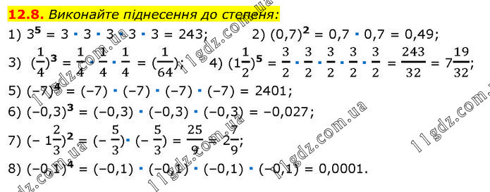 Виконайте піднесення до степеня: 1) 35 = 3 ∙ 3 ∙ 3 ∙ 3 ∙ 3 = 243; 2) (0,7)2 = 0,7 ∙ 0,7 = 0,49; 3) (1/4)3 = 1/4 ∙ 1/4 ∙ 1/4 = (1/64); 4) (11/2)5 = 3/2 ∙ 3/2 ∙ 3/2 ∙ 3/2 ∙ 3/2 = 243/32 = 719/32; 5) (–7)4 = (–7) ∙ (–7) ∙ (–7) ∙ (–7) = 2401; 6) (–0,3)3 = (–0,3) ∙ (–0,3) ∙ (–0,3) = –0,027; 7) (– 12/3)2 = (– 5/3)∙ (– 5/3) = 25/9 = 27/9; 8) (–0,1)4 = (–0,1) ∙ (–0,1) ∙ (–0,1) ∙ (–0,1) = 0,0001.