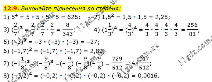Виконайте піднесення до степеня: 1) 54 = 5 ∙ 5 ∙ 5 ∙ 5 = 625; 2) 1,52 = 1,5 ∙ 1,5 = 2,25; 3) (2/7)3 = 2/7 ∙ 2/7 ∙ 2/7 = 8/343; 4) (11/3)4 = (4/3)4 = 4/3 ∙ 4/3 ∙ 4/3 ∙ 4/3 = 256/81; 5) (–3)3 = –3 ∙ (–3) ∙ (–3) = –27; 6) (–1,7)2 = (–1,7) ∙ (–1,7) = 2,89; 7) (–11/8)3= (– 9/8)3 =(– 9/8) (– 9/8)(– 9/8) = 729/512 = –1217/512; 8) (–0,2)4 = (–0,2) ∙ (–0,2) ∙ (–0,2) ∙ (–0,2) = 0,0016.