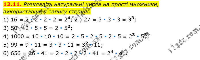 Розкладіть натуральні числа на прості множники, використавши у запису степінь: 1) 16 = 2 ∙ 2 ∙ 2 ∙ 2 = 24; 2 ) 27 = 3 ∙ 3 ∙ 3 = З3; 3) 50 = 2 ∙ 5 ∙ 5 = 2 ∙ 52; 4) 1000 = 10 ∙ 10 ∙ 10 = 2 ∙ 5 ∙ 2 ∙ 5 ∙ 2 ∙ 5 = 23 ∙ 53; 5) 99 = 9 ∙ 11 = 3 ∙ 3 ∙ 11 = З2 ∙ 11; 6) 656 = 16 ∙ 41 = 2 ∙ 2 ∙ 2 ∙ 2 ∙ 41 = 24 ∙ 41.