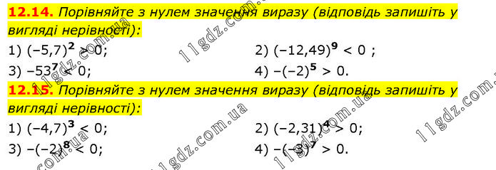12.14. Порівняйте з нулем значення виразу (відповідь запишіть у вигляді нерівності): 1) (–5,7)2 > 0; 3) –537 < 0; 2) (–12,49)9 < 0 ; 4) –(–2)5 > 0. 12.15. Порівняйте з нулем значення виразу (відповідь запишіть у вигляді нерівності): 1) (–4,7)3 < 0; 3) –(–2)8 < 0; 2) (–2,31)4 > 0; 4) –(–З)7 > 0.