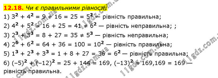 Чи є правильними рівності: 1) З2 + 42 = 9 + 16 = 25 = 52 — рівність правильна; 2) 42 + 52 = 16 + 25 = 41 ≠ б2 — рівність неправильна; ; 3) 23 + З3 = 8 + 27 = 35 ≠ 53 — рівність неправильна; 4) 26 + 62 = 64 + 36 = 100 = 102 — рівність правильна; 5) 13 + 23 + З3 = 1 + 8 + 27 = 36 = 62 — рівність правильна; 6) (–5)2 + (–12)2 = 25 + 144 = 169, (–13)2 = 169,169 = 169 — рівність правильна.