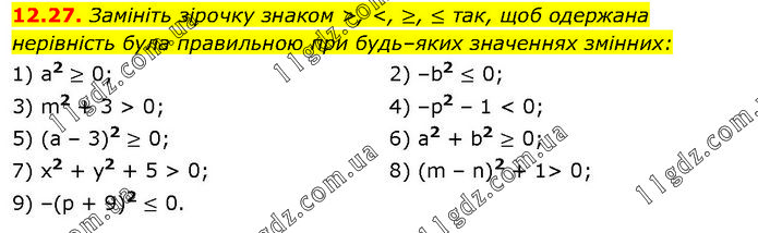Замініть зірочку знаком >, <, ≥, ≤ так, щоб одержана нерівність була правильною при будь–яких значеннях змінних: 1) а2 ≥ 0; 3) m2 + 3 > 0; 5) (а – 3)2 ≥ 0; 7) x2 + y2 + 5 > 0; 9) –(р + 9)2 ≤ 0. 2) –b2 ≤ 0; 4) –р2 – 1 < 0; 6) а2 + b2 ≥ 0; 8) (m – n)2 + 1> 0;