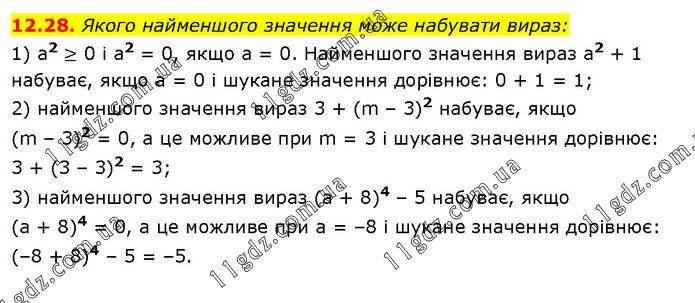 Якого найменшого значення може набувати вираз: 1) а2 ≥ 0 і а2 = 0, якщо а = 0. Найменшого значення вираз а2 + 1 набуває, якщо а = 0 і шукане значення дорівнює: 0 + 1 = 1; 2) найменшого значення вираз 3 + (m – 3)2 набуває, якщо (m – 3)2 = 0, а це можливе при m = 3 і шукане значення дорівнює: 3 + (3 – 3)2 = 3; 3) найменшого значення вираз (а + 8)4 – 5 набуває, якщо (а + 8)4 = 0, а це можливе при а = –8 і шукане значення дорівнює: (–8 + 8)4 – 5 = –5.