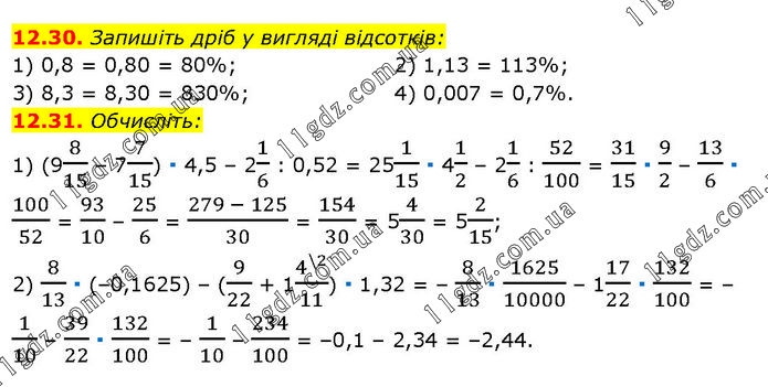 12.30. Запишіть дріб у вигляді відсотків: 1) 0,8 = 0,80 = 80%; 3) 8,3 = 8,30 = 830%; 2) 1,13 = 113%; 4) 0,007 = 0,7%. 12.31. Обчисліть: 1) (98/15 – 77/15) ∙ 4,5 – 21/6 : 0,52 = 251/15 ∙ 41/2 – 21/6 : 52/100 = 31/15 ∙ 9/2 – 13/6 ∙ 100/52 = 93/10 – 25/6 = (279 - 125)/30 = 154/30 = 54/30 = 52/15; 2) 8/13 ∙ (–0,1625) – (9/22 + 14^(\2)/11) ∙ 1,32 = – 8/13 ∙ 1625/10000 – 117/22 ∙ 132/100 = – 1/10 – 39/22 ∙ 132/100 = – 1/10 – 234/100 = –0,1 – 2,34 = –2,44.