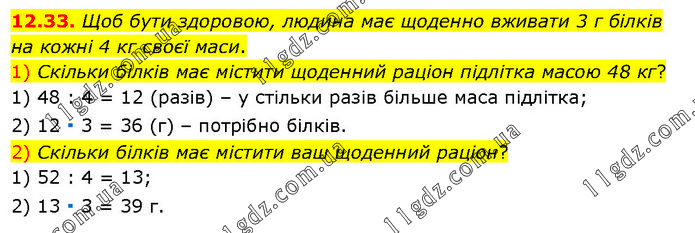 12.33. Щоб бути здоровою, людина має щоденно вживати 3 г білків на кожні 4 кг своєї маси. 1) Скільки білків має містити щоденний раціон підлітка масою 48 кг? 1) 48 : 4 = 12 (разів) – у стільки разів більше маса підлітка; 2) 12 ∙ 3 = 36 (г) – потрібно білків. 2) Скільки білків має містити ваш щоденний раціон? 1) 52 : 4 = 13; 2) 13 ∙ 3 = 39 г.