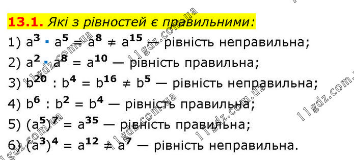 Які з рівностей є правильними: 1) а3 ∙ а5 = a8 ≠ а15 — рівність неправильна; 2) а2 ∙ а8 = а10 — рівність правильна; 3) b20 : b4 = b16 ≠ b5 — рівність неправильна; 4) b6 : b2 = b4 — рівність правильна; 5) (а5)7 = а35 — рівність правильна; 6) (а3)4 = а12 ≠ а7 — рівність неправильна.