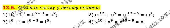 Запишіть частку у вигляді степеня: 1) b5 : b3 = b5 – 3 = b2; 3) t6 : t = t6 – 1 = t5; 2) m12 : m5 = m12 – 5 = m7; 4) x10 : x9 = x10 – 9 = x.