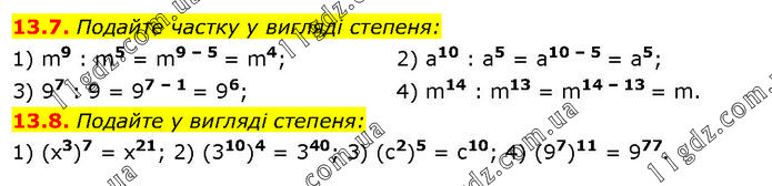 13.7. Подайте частку у вигляді степеня: 1) m9 : m5 = m9 – 5 = m4; 3) 97 : 9 = 97 – 1 = 96; 2) a10 : a5 = a10 – 5 = a5; 4) m14 : m13 = m14 – 13 = m. 13.8. Подайте у вигляді степеня: 1) (x3)7 = x21; 2) (310)4 = 340; 3) (c2)5 = c10; 4) (97)11 = 977.