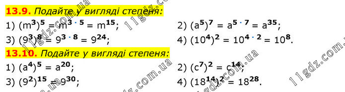 13.9. Подайте у вигляді степеня: 1) (m3)5 = m3 ∙ 5 = m15; 3) (93)8 = 93 ∙ 8 = 924; 2) (а5)7 = а5 ∙ 7 = а35; 4) (104)2 = 104 ∙ 2 = 108. 13.10. Подайте у вигляді степеня: 1) (a4)5 = a20; 3) (92)15 = 930; 2) (c7)2 = c14; 4) (1814)2 = 1828.