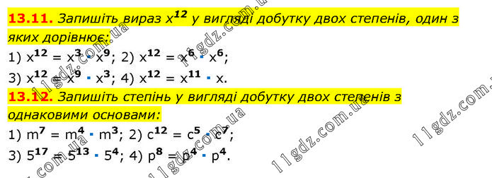 13.11. Запишіть вираз х12 у вигляді добутку двох степенів, один з яких дорівнює: 1) x12 = x3 ∙ х9; 2) x12 = x6 ∙ х6; 3) x12 = x9 ∙ x3; 4) x12 = x11 ∙ x. 13.12. Запишіть степінь у вигляді добутку двох степенів з однаковими основами: 1) m7 = m4 ∙ m3; 2) c12 = c5 ∙ c7; 3) 517 = 513 ∙ 54; 4) p8 = p4 ∙ p4.
