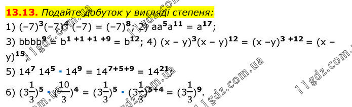 Подайте добуток у вигляді степеня: 1) (–7)3(–7)4 (–7) = (–7)8; 2) aa5a11 = a17; 3) bbbb9 = b1 +1 +1 +9 = b12; 4) (x – y)3(x – y)12 = (x –y)3 +12 = (x – y)15; 5) 147 145 ∙ 149 = 147+5+9 = 1421; 6) (31/3)5 ∙ (10/3)4 = (31/3)5 ∙ (31/3)5+4 = (31/3)9.