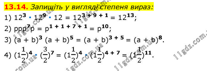 Запишіть у вигляді степеня вираз: 1) 123 ∙ 129 ∙ 12 = 123 + 9 + 1 = 1213; 2) ррр7р = р1 + 1 + 7 + 1 = р10; 3) (а + b)3 (а + b)5 = (а + b)3 + 5 = (a + b)8. 4) (11/2)4 ∙ (3/2)7 = (11/2)4 ∙ (11/2)4 + 7 = (11/2)11.