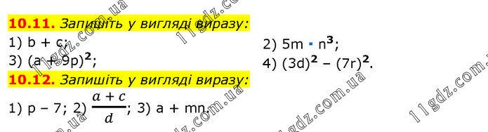 10.11. Запишіть у вигляді виразу: 1) b + c; 3) (a + 9p)2; 2) 5m ∙ n3; 4) (3d)2 – (7r)2. 10.12. Запишіть у вигляді виразу: 1) p – 7; 2) (a + c)/d; 3) a + mn.