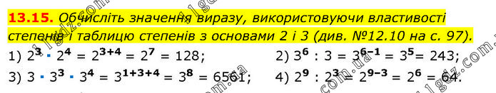 Обчисліть значення виразу, використовуючи властивості степенів і таблицю степенів з основами 2 і 3 (див. №12.10 на с. 97). 1) 23 ∙ 24 = 23+4 = 27 = 128; 3) 3 ∙ 33 ∙ 34 = 31+3+4 = 38 = 6561; 2) З6 : 3 = 36–1 = 35= 243; 4) 29 : 23 = 29–3 = 26 = 64.