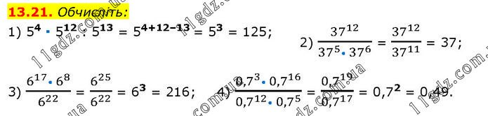 Обчисліть: 1) 54 ∙ 512 : 513 = 54+12–13 = 53 = 125; 2) 37^12/(37^5• 37^6 ) = 37^12/37^11 = 37; 3) (6^17• 6^8)/6^22 = 6^25/6^22 = 63 = 216; 4) (〖0,7〗^3•〖 0,7〗^16)/(〖0,7〗^12•〖 0,7〗^5 ) = 〖0,7〗^19/〖0,7〗^17 = 0,72 = 0,49.