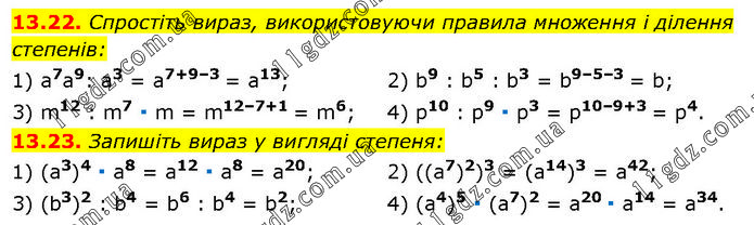 13.22. Спростіть вираз, використовуючи правила множення і ділення степенів: 1) a7a9: a3 = a7+9–3 = a13; 3) m12 : m7 ∙ m = m12–7+1 = m6; 2) b9 : b5 : b3 = b9–5–3 = b; 4) p10 : p9 ∙ p3 = p10–9+3 = p4. 13.23. Запишіть вираз у вигляді степеня: 1) (a3)4 ∙ a8 = a12 ∙ a8 = a20; 3) (b3)2 : b4 = b6 : b4 = b2; 2) ((a7)2)3 = (a14)3 = a42; 4) (a4)5 ∙ (a7)2 = a20 ∙ a14 = a34.