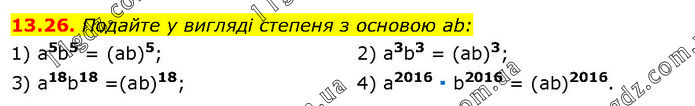 Подайте у вигляді степеня з основою ab: 1) а5b5 = (аb)5; 3) a18b18 =(ab)18; 2) а3b3 = (ab)3; 4) a2016 ∙ b2016 = (ab)2016.