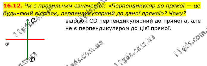Чи є правильним означення: «Перпендикуляр до прямої — це будь–який відрізок, перпендикулярний до даної прямої»? Чому? відрізок CD перпендикулярний до прямої а, але не є перпендикуляром до цієї прямої.