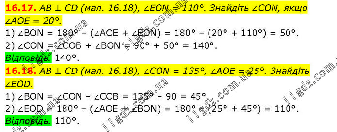 16.17. AB ⊥ CD (мал. 16.18), ∠EON = 110°. Знайдіть ∠CON, якщо ∠AOE = 20°. 1) ∠BON = 180° – (∠AOE + ∠EON) = 180° – (20° + 110°) = 50°. 2) ∠CON = ∠COB + ∠BON = 90° + 50° = 140°. Відповідь. 140°. 16.18. AB ⊥ CD (мал. 16.18), ∠CON = 135°, ∠AOE = 25°. Знайдіть ∠EOD. 1) ∠BON = ∠CON – ∠COB = 135° – 90 = 45°. 2) ∠EOD = 180° – (∠AOE + ∠BON) = 180° – (25° + 45°) = 110°. Відповідь. 110°.