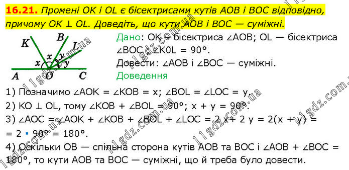 Промені OK і OL є бісектрисами кутів AOB і BOC відповідно, причому OK ⊥ OL. Доведіть, що кути AOB і BOC — суміжні. Дано: OK – бісектриса ∠AOB; OL — бісектриса ∠BOC ; ∠K0L = 90°. Довести: ∠AOB і ∠BOC — суміжні. Доведення 1) Позначимо ∠AOK = ∠KOB = х; ∠BOL = ∠LOC = у. 2) KO ⊥ OL, тому ∠KOB + ∠BOL = 90°; х + у = 90°. 3) ∠AOC = ∠AOK + ∠KOB + ∠BOL + ∠LOC = 2 x+ 2 y = 2(x + y) = = 2 ∙ 90° = 180°. 4) Оскільки OB — спільна сторона кутів AOB та BOC і ∠AOB + ∠BOC = 180°, то кути AOB та BOC — суміжні, що й треба було довести.